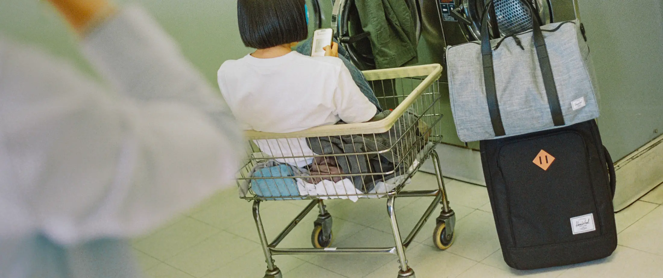 A Herschel Heritage® Softshell Large Carry-On Luggage in black being pushed in an airport luggage cart.